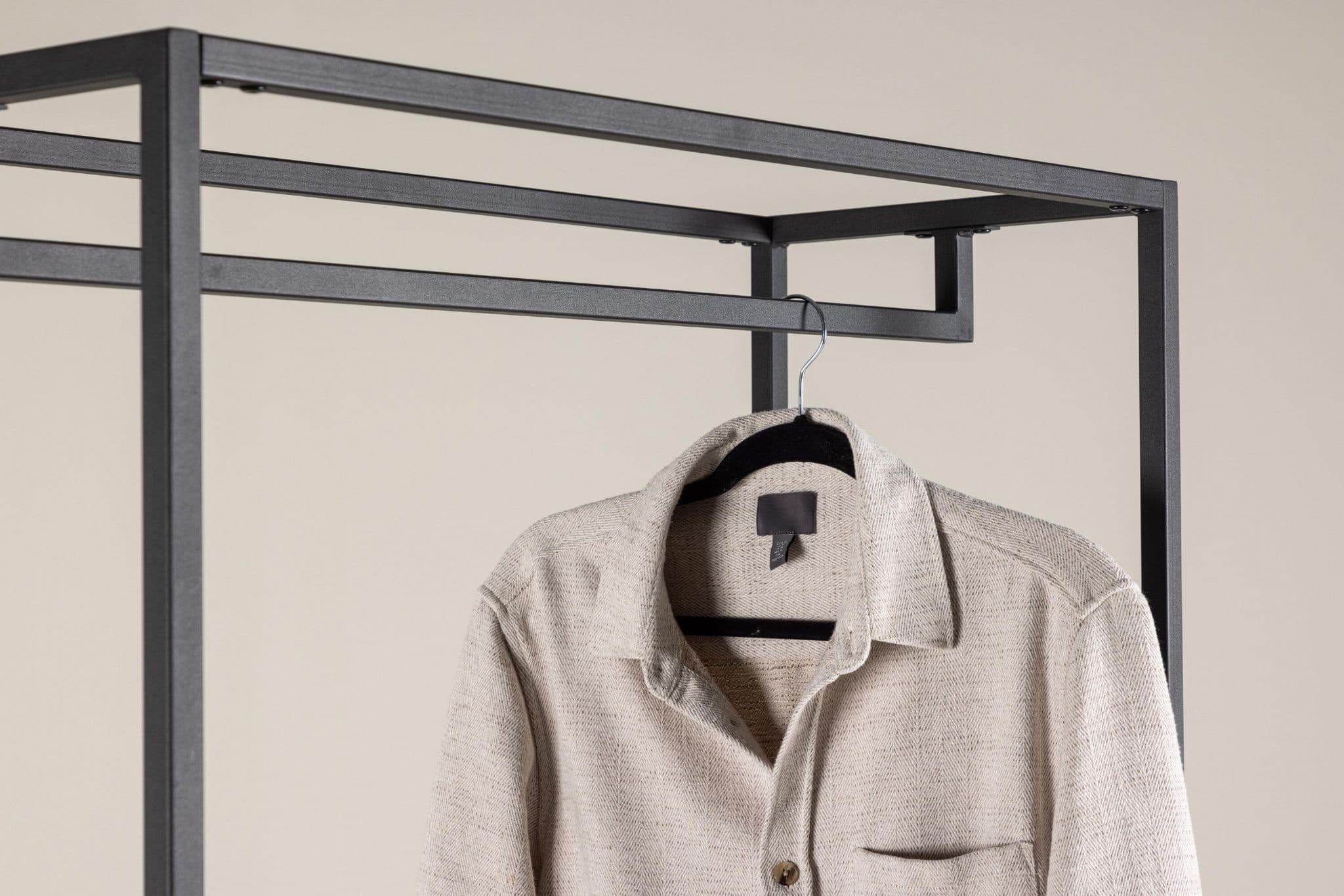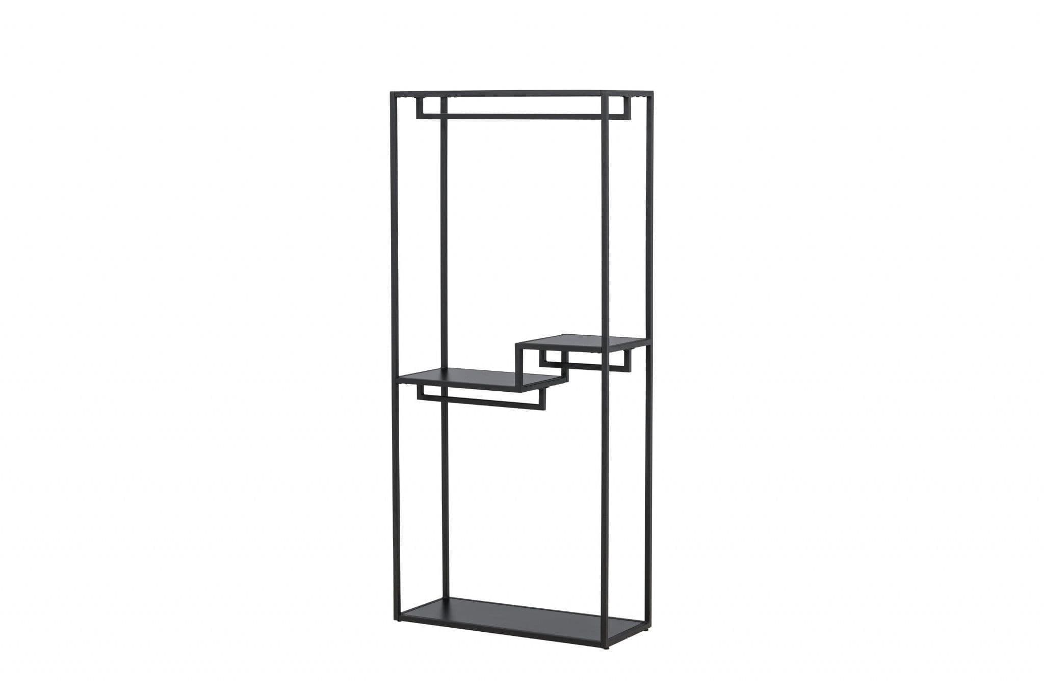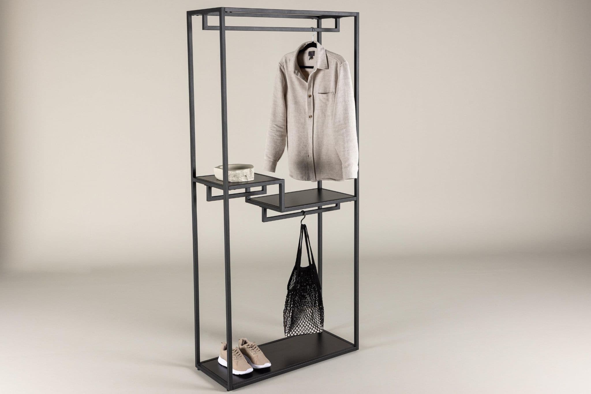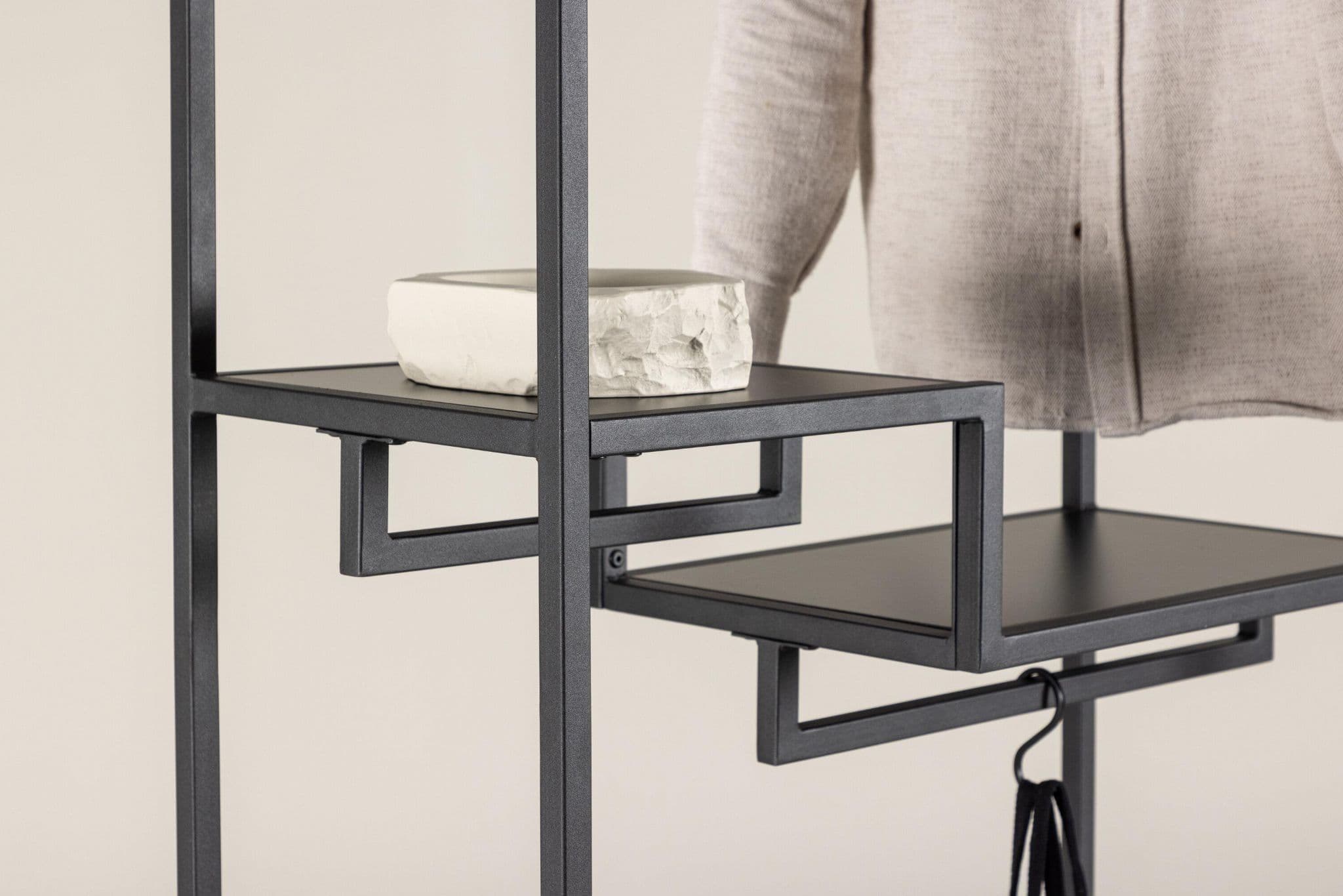 Meet style and order with our clothes rack Staal, the perfect companion for organizing your textiles with a touch of modern elegance. Made of durable black steel, Staal is not just a practical solution but also a tasteful interior detail that complements your home in the best way.Staal's simple and stylish design gives it a timeless aesthetic that fits perfectly into various rooms. The black color provides a modern expression and makes Staal a stylish interior detail. Place it in the hallway, bedroom, or wherever you desire a dose of style and organization.What sets Staal apart is its clever shelving. Two smaller shelves provide space for jewelry, folded clothes, or other small accessories, while the larger shelf offers the opportunity to arrange and display larger items with ease.And as if that weren't enough - Staal's design also includes space for hangers. Hang your favorite clothes in a stylish way, allowing them to be both easily accessible and well-organized.Organize your textiles with playful ease with the help of Staal. It's not just a clothes rack but also a piece of furniture that makes a statement. Staal gives you the opportunity to combine functionality with aesthetics in an impressive way.Choose Staal - your faithful partner in creating order and style in every corner of your home!